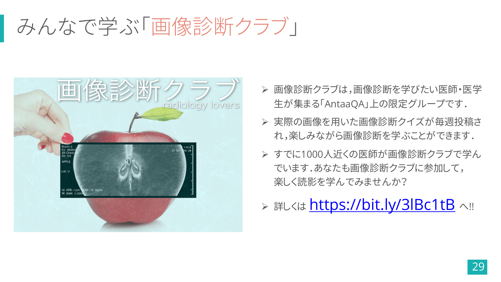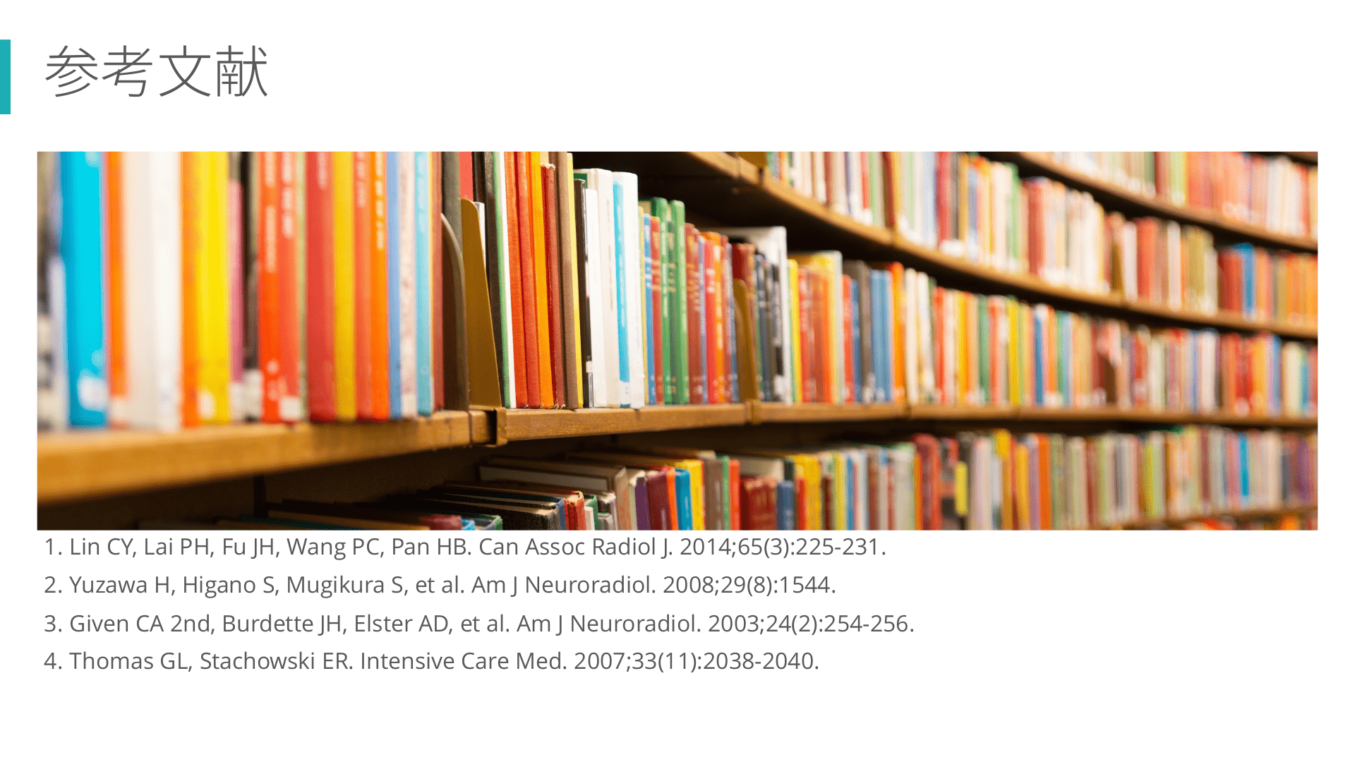 参考文献 1. Lin CY, Lai PH, Fu JH, Wang PC, Pan HB. Can Assoc Radiol J. 2014;65(3):225-231. 2. Yuzawa H, Higano S, Mugikura S, et al. Am J Neuroradiol. 2008;29(8):1544. 3. Given CA 2nd, Burdette JH, Elster AD, et al. Am J Neuroradiol. 2003;24(2):254-256. 4. Thomas GL, Stachowski ER. Intensive Care Med. 2007;33(11):2038-2040. #28. このプレゼンテーションを作った人 和田 武(わだ たけし) 千葉大学病院放射線科 画像診断・IVR(画像下治療) 「画像診断をもっと身近に,面白く」 がモットーの放射線科医です. ご質問・講演依頼は @wadase2 https://twitter.com/wadase2 までご連絡(DM)ください. #29. みんなで学ぶ「画像診断クラブ」 Ø 画像診断クラブは,画像診断を学びたい医師・医学 生が集まる「AntaaQA」上の限定グループです. Ø 実際の画像を用いた画像診断クイズが毎週投稿さ れ,楽しみながら画像診断を学ぶことができます. Ø すでに1000人近くの医師が画像診断クラブで学ん でいます.あなたも画像診断クラブに参加して, 楽しく読影を学んでみませんか? Ø 詳しくは https://bit.ly/3lBc1tB へ!! 29
