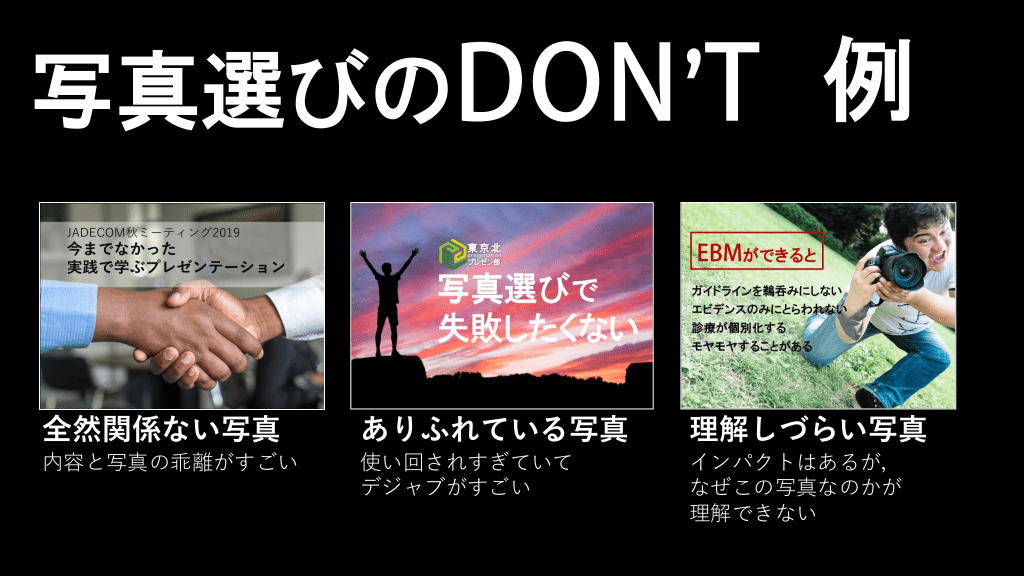 #10. 写真選びの ’ 全然関係ない写真 なんとなくかっこいいだけ ありふれている写真 ネットでよく見る写真.オリジナリティがない 間接的な表現で直感で理解できない写真 比喩が凝り過ぎて,よくわからない