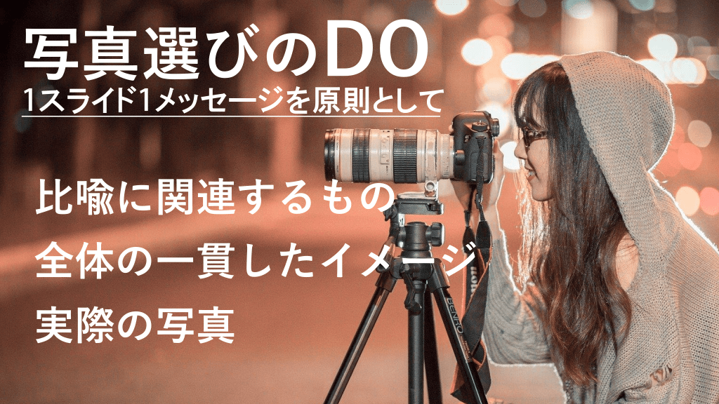 #3. 写真選びのDO スライド メッセージを原則として 比喩に関連するもの 全体の一貫したイメージ 実際の写真