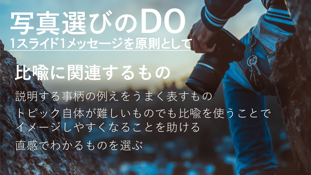 #4. 写真選びのDO スライド メッセージを原則として 比喩に関連するもの 説明する事柄の例えをうまく表すもの トピック自体が難しいものでも比喩を使うことで イメージしやすくなることを助ける 直感でわかるものを選ぶ