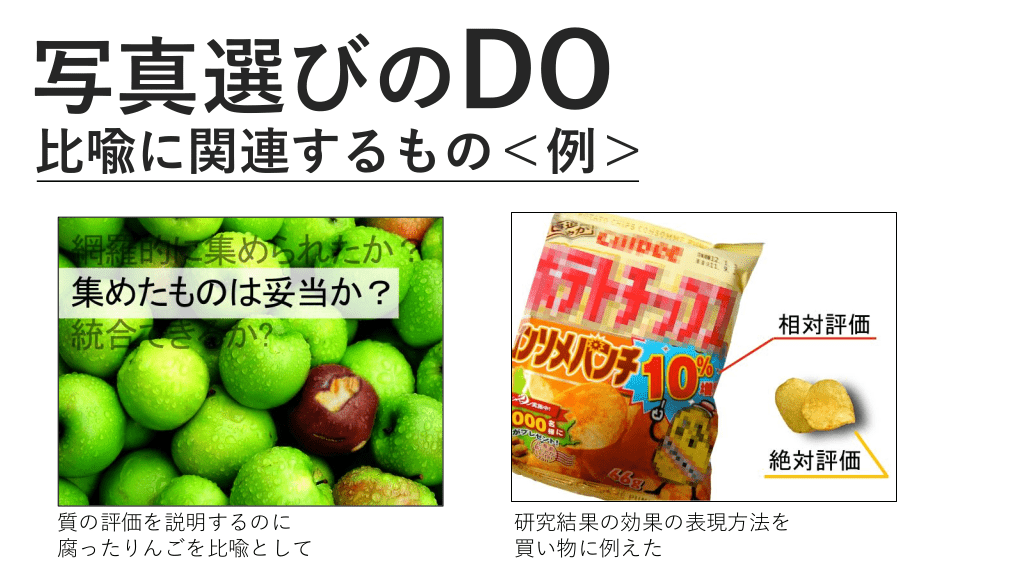 #5. 写真選びのDO 比喩に関連するもの<例> 質の評価を説明するのに 腐ったりんごを比喩として 研究結果の効果の表現方法を 買い物に例えた