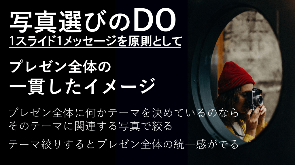#6. 写真選びのDO スライド メッセージを原則として プレゼン全体の 一貫したイメージ プレゼン全体に何かテーマを決めているのなら そのテーマに関連する写真で絞る テーマ絞りするとプレゼン全体の統一感がでる