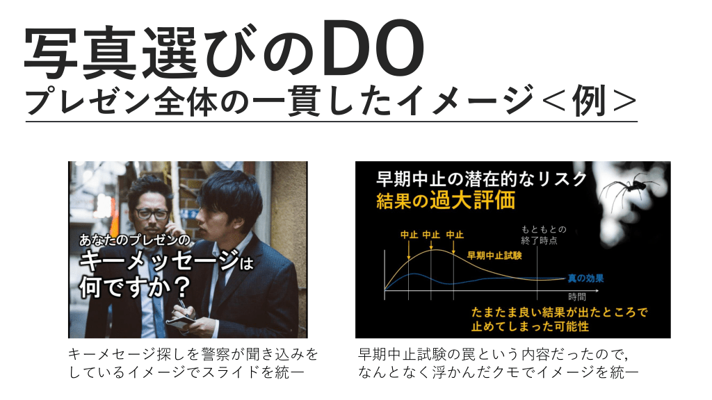 #7. 写真選びのDO プレゼン全体の一貫したイメージ<例> キーメセージ探しを警察が聞き込みを しているイメージでスライドを統一 早期中止試験の罠という内容だったので, なんとなく浮かんだクモでイメージを統一