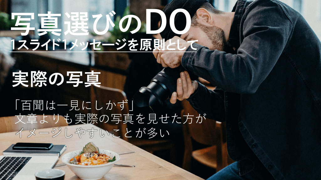 #8. 写真選びのDO スライド メッセージを原則として 実際の写真 「百聞は一見にしかず」 文章よりも実際の写真を見せた方が イメージしやすいことが多い