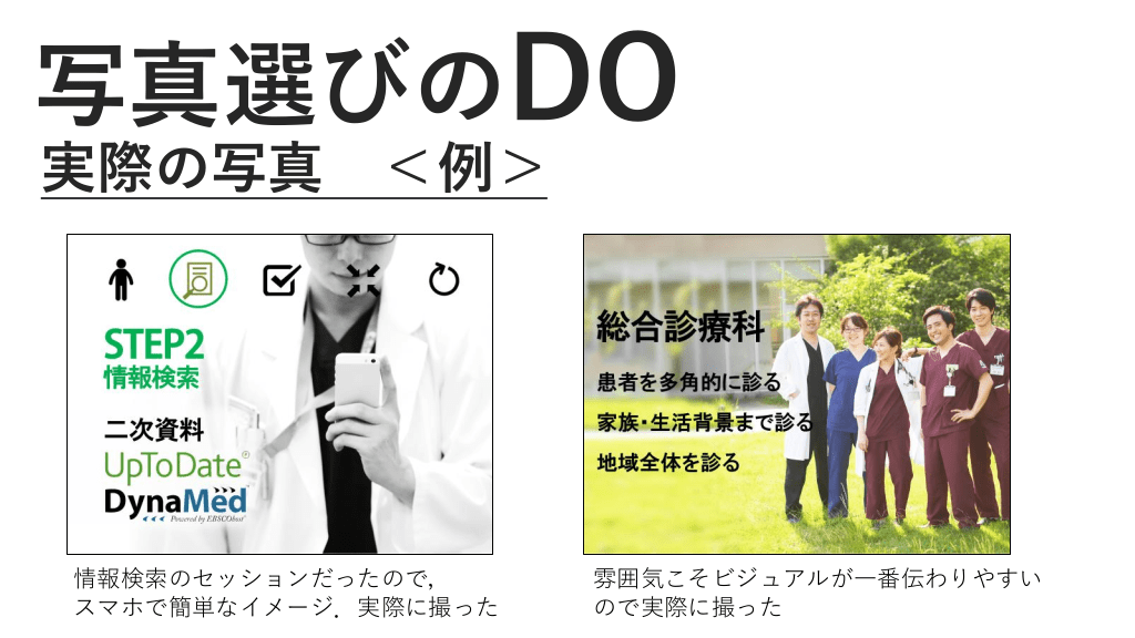 #9. 写真選びのDO 実際の写真 <例> 情報検索のセッションだったので, スマホで簡単なイメージ.実際に撮った 雰囲気こそビジュアルが一番伝わりやすい ので実際に撮った
