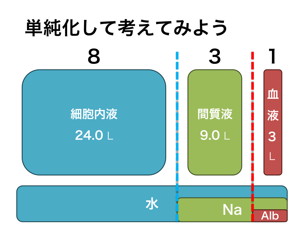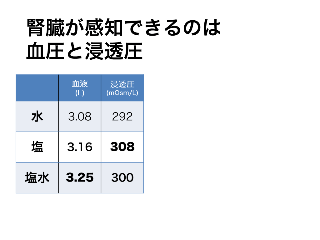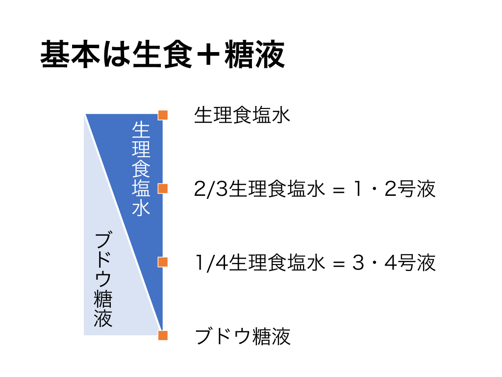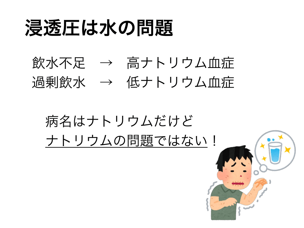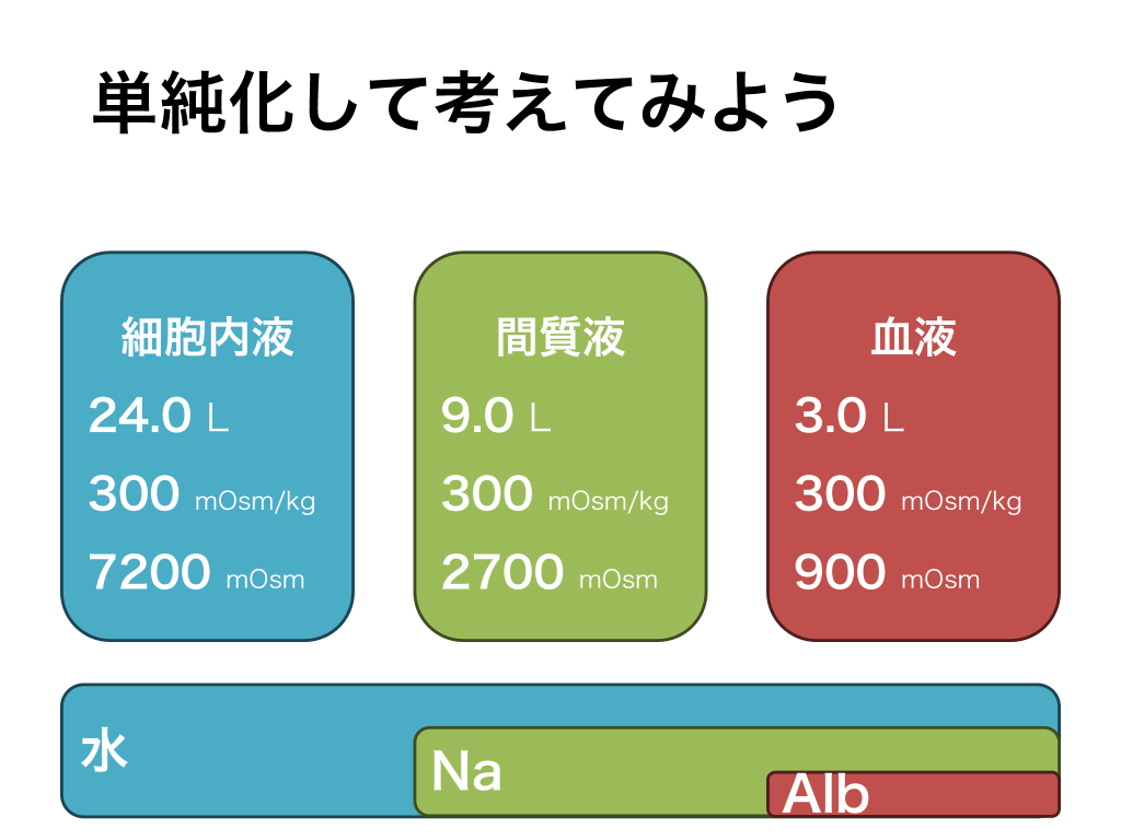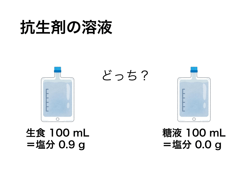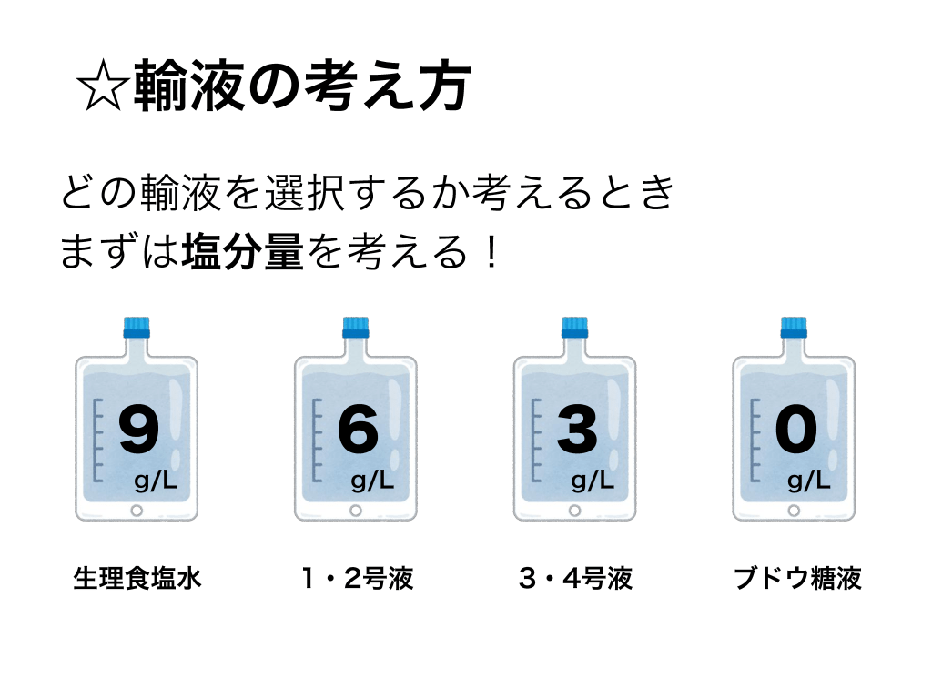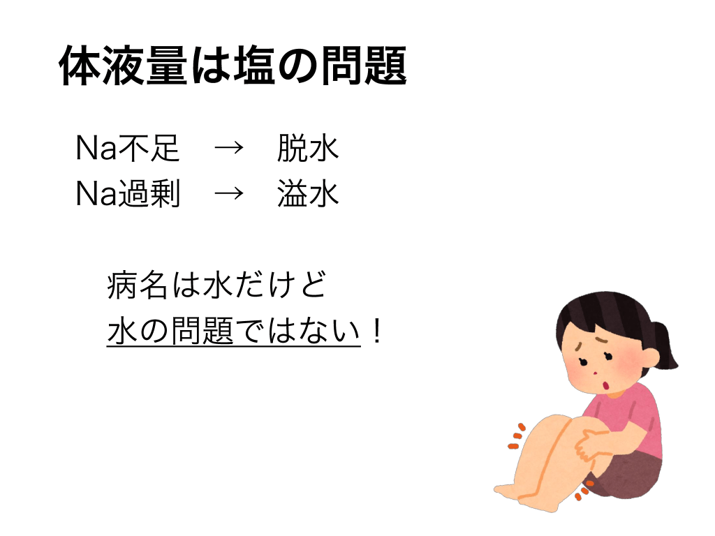輸液を、水と塩に分けて考えてみようというスライドです。