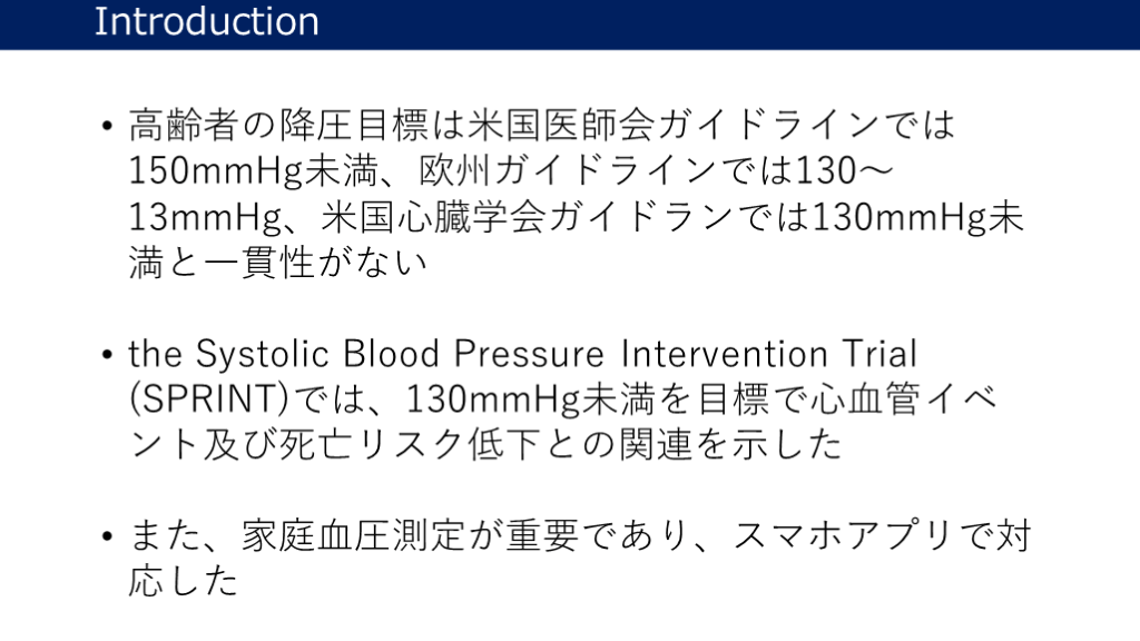 #2. Introduction 高齢者の降圧目標は米国医師会ガイドラインでは150mmHg未満、欧州ガイドラインでは130~13mmHg、米国心臓学会ガイドランでは130mmHg未満と一貫性がない