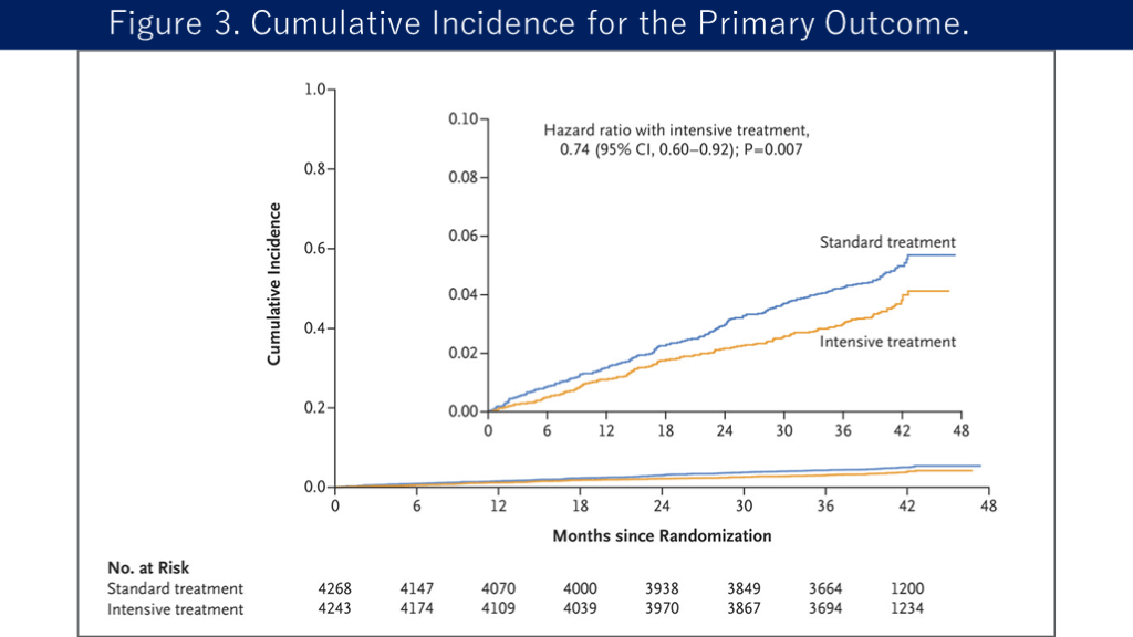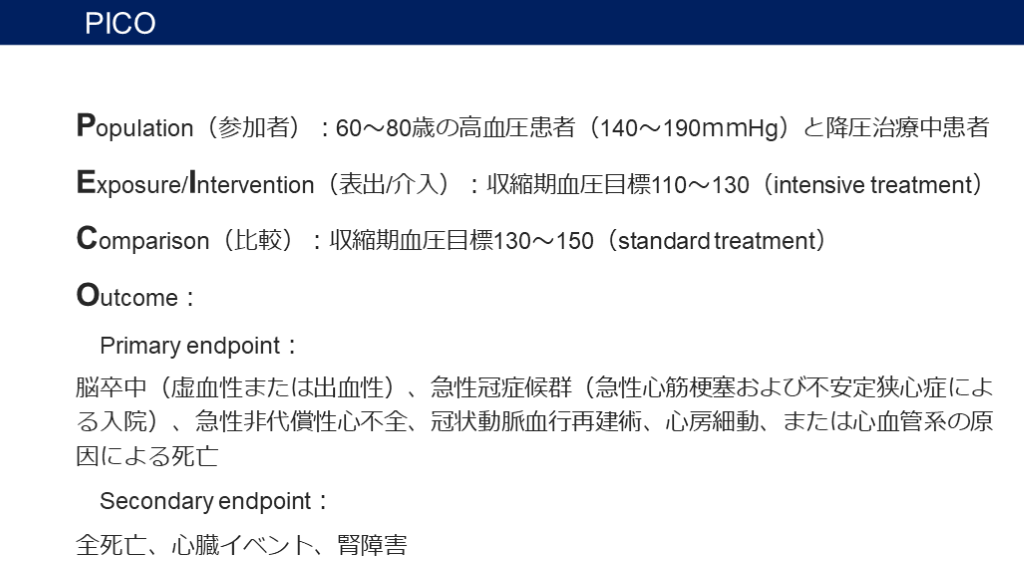 Exposure/Intervention(表出/介入):収縮期血圧目標110~130(intensive treatment)