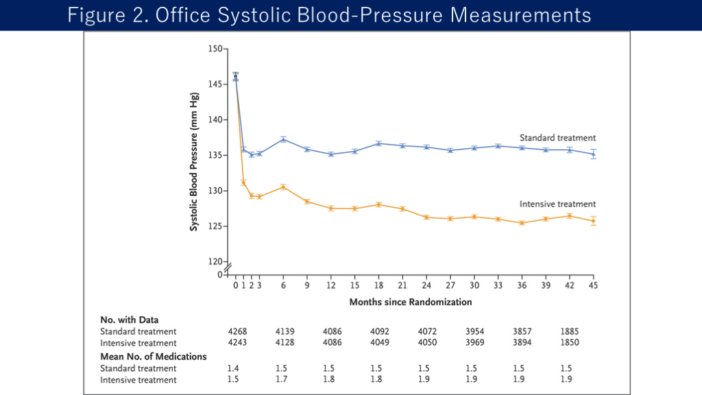 the Systolic Blood Pressure Intervention Trial (SPRINT)では、130mmHg未満を目標で心血管イベント及び死亡リスク低下との関連を示した