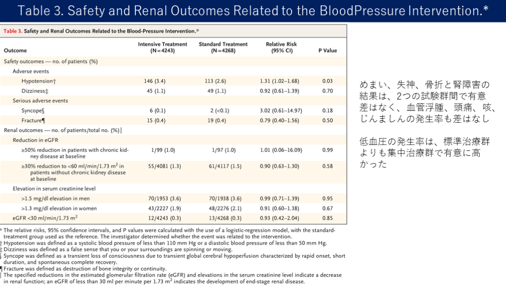 #10. Table 3. Safety and Renal Outcomes Related to the BloodPressure Intervention.* めまい、失神、骨折と腎障害の結果は、2つの試験群間で有意差はなく、血管浮腫、頭痛、咳、じんましんの発生率も差はなし
