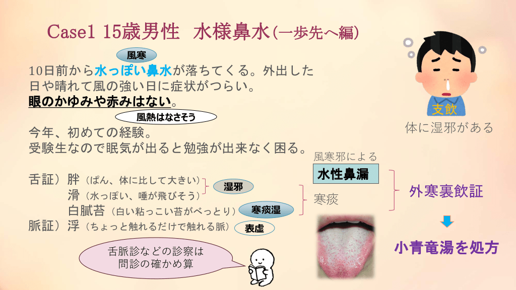 #10. Case1 15歳男性 水様鼻水(一歩先へ編) 風寒 10日前から水っぽい鼻水が落ちてくる。外出した 日や晴れて風の強い日に症状がつらい。 眼のかゆみや赤みはない。 支飲 体に湿邪がある 風熱はなさそう 今年、初めての経験。 受験生なので眠気が出ると勉強が出来なく困る。 舌証)胖(ぱん、体に比して大きい) 湿邪 滑(水っぽい、唾が飛びそう) 白膩苔(白い粘っこい苔がべっとり) 寒痰湿 脈証)浮(ちょっと触れるだけで触れる脈) 表虚 舌脈診などの診察は 問診の確かめ算 風寒邪による 水性鼻漏 寒痰 外寒裏飲証 小青竜湯を処方