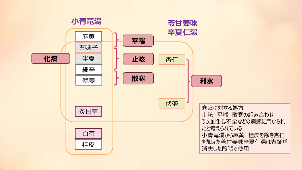 #11. 小青竜湯 麻黄 五味子 化痰 半夏 細辛 乾姜 炙甘草 白芍 桂皮 平喘 止咳 苓甘姜味 辛夏仁湯 杏仁 散寒 利水 伏苓 寒痰に対する処方 止咳 平喘 散寒の組み合わせ うっ血性心不全などの病態に用いられ たと考えられている 小青竜湯から麻黄 桂皮を除き杏仁 を加えた苓甘姜味辛夏仁湯は表証が 消失した段階で使用