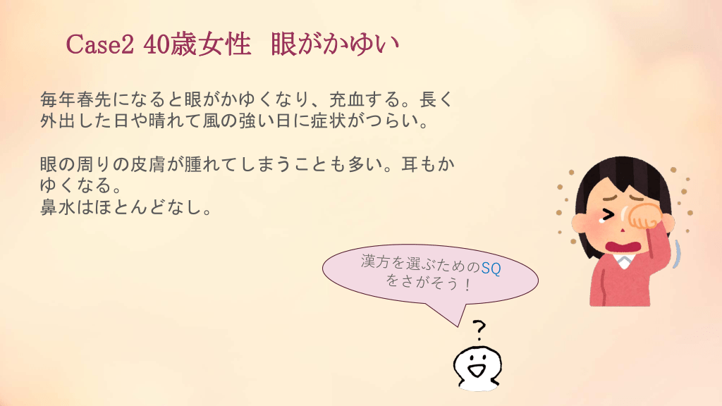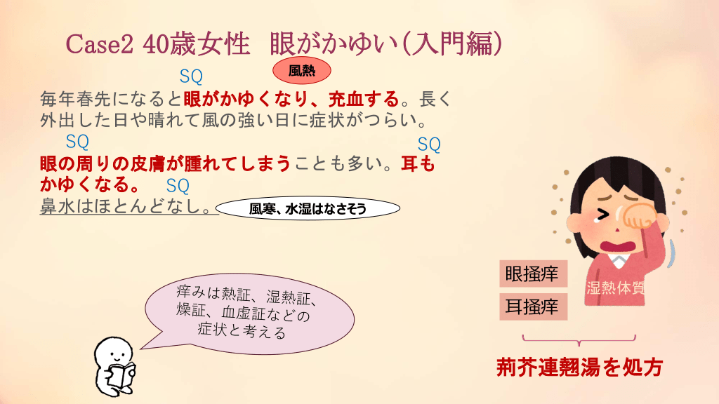 #13. Case2 40歳女性 眼がかゆい(入門編) 風熱 SQ 毎年春先になると眼がかゆくなり、充血する。長く 外出した日や晴れて風の強い日に症状がつらい。 SQ SQ 眼の周りの皮膚が腫れてしまうことも多い。耳も かゆくなる。 SQ 鼻水はほとんどなし。 風寒、水湿はなさそう 眼掻痒 耳掻痒 湿熱体質 荊芥連翹湯を処方