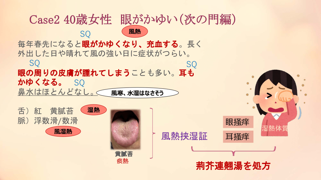 #14. Case2 40歳女性 眼がかゆい(次の門編) 風熱 SQ 毎年春先になると眼がかゆくなり、充血する。長く 外出した日や晴れて風の強い日に症状がつらい。 SQ SQ 眼の周りの皮膚が腫れてしまうことも多い。耳も かゆくなる。 SQ 鼻水はほとんどなし。 風寒、水湿はなさそう 舌)紅 黄膩苔 脈)浮数滑/数滑 湿熱 眼掻痒 風湿熱 風熱挟湿証 黄膩苔 痰熱 耳掻痒 湿熱体質 荊芥連翹湯を処方