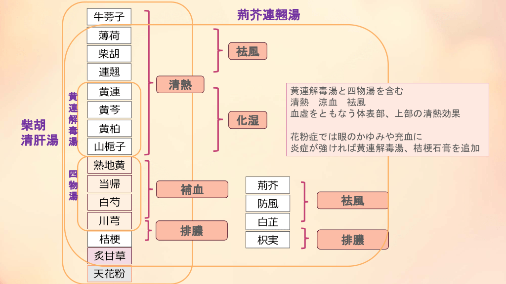 #15. 荊芥連翹湯 牛蒡子 薄荷 袪風 柴胡 連翹 柴胡 清肝湯 黄 連 解 毒 湯 四 物 湯 黄連 清熱 黄芩 化湿 黄柏 黄連解毒湯と四物湯を含む 清熱 涼血 袪風 血虚をともなう体表部、上部の清熱効果 花粉症では眼のかゆみや充血に 炎症が強ければ黄連解毒湯、桔梗石膏を追加 山梔子 熟地黄 当帰 白芍 川芎 桔梗 炙甘草 天花粉 補血 荊芥 防風 排膿 袪風 白芷 枳実 排膿