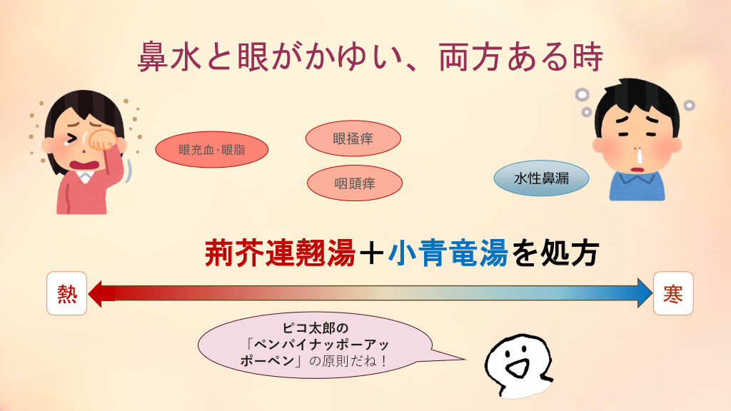 #16. 鼻水と眼がかゆい、両方ある時 眼充血・眼脂 眼掻痒 咽頭痒 水性鼻漏 荊芥連翹湯+小青竜湯を処方 熱 寒 ピコ太郎の 「ペンパイナッポーアッ ポーペン」の原則だね!
