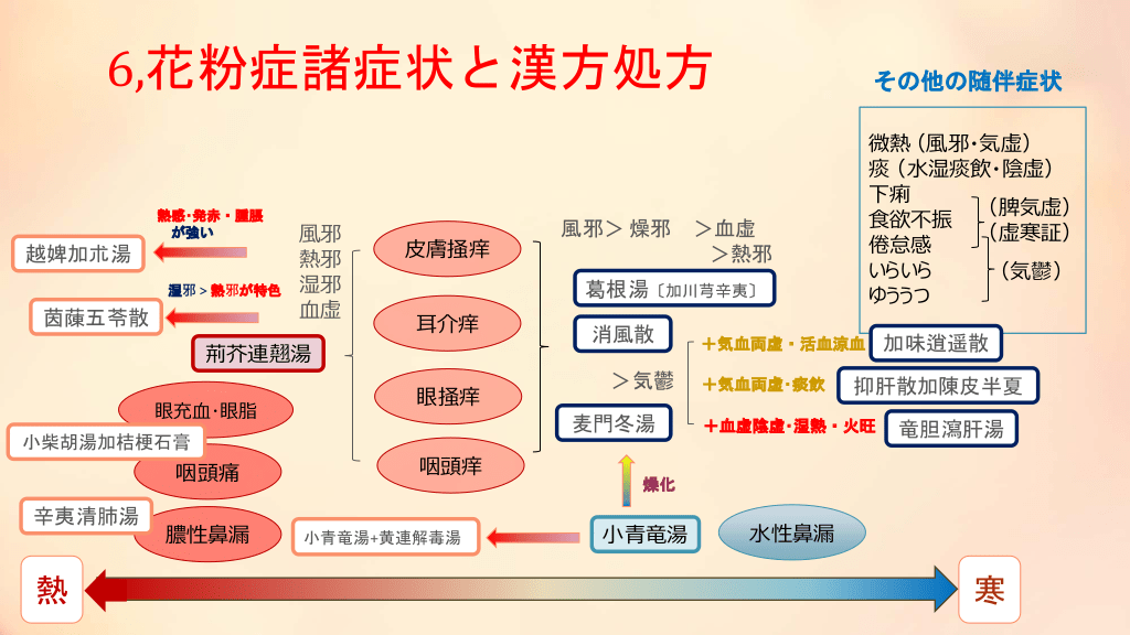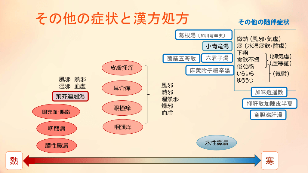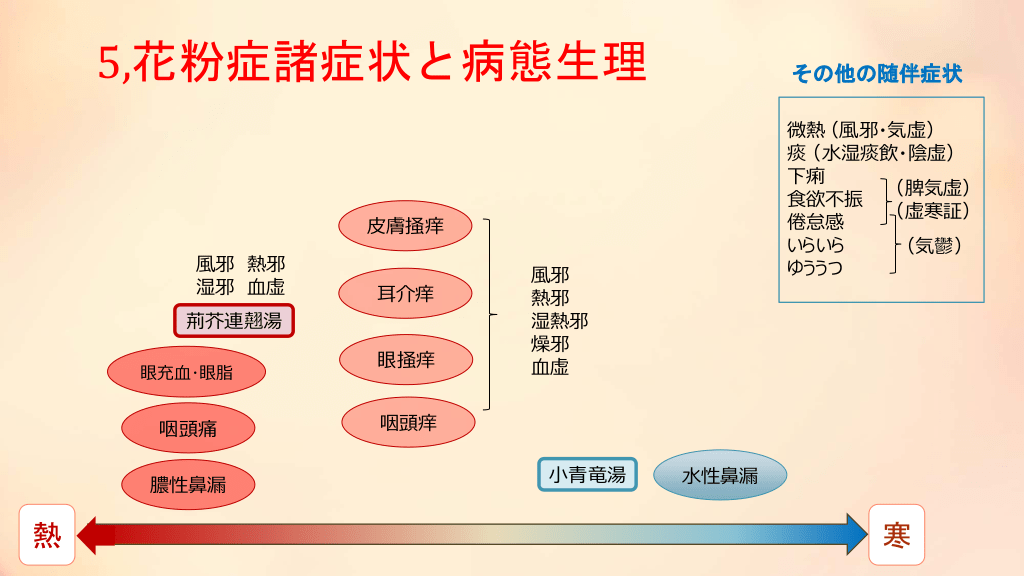 #17. 5,花粉症諸症状と病態生理 その他の随伴症状 微熱(風邪・気虚) 痰(水湿痰飲・陰虚) 下痢 (脾気虚) 食欲不振 (虚寒証) 倦怠感 いらいら (気鬱) ゆううつ 皮膚掻痒 風邪 熱邪 湿邪 血虚 荊芥連翹湯 眼充血・眼脂 咽頭痛 膿性鼻漏 熱 耳介痒 眼掻痒 風邪 熱邪 湿熱邪 燥邪 血虚 咽頭痒 小青竜湯 水性鼻漏 寒