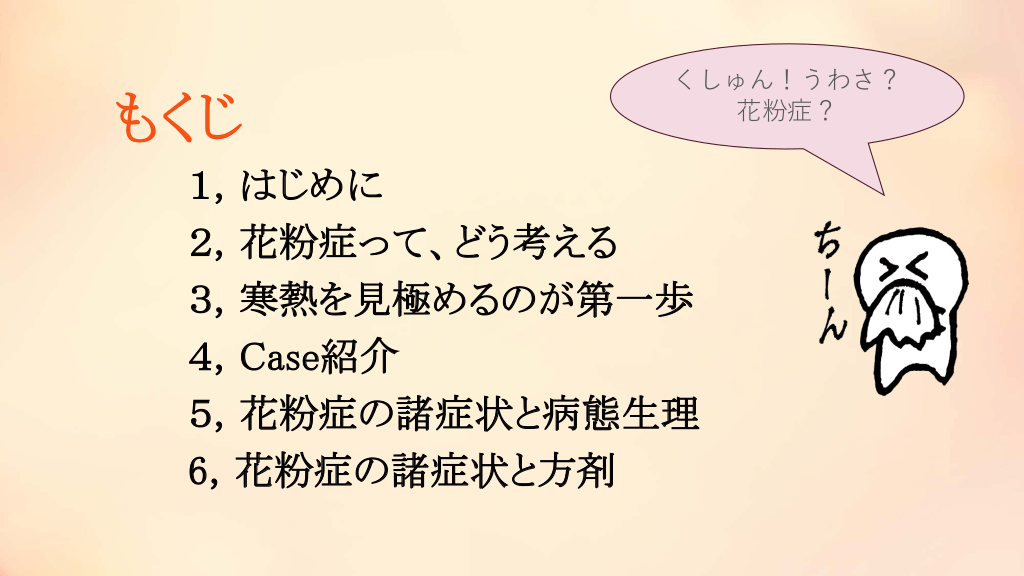 #2. もくじ くしゅん!うわさ? 花粉症? 1,はじめに 2,花粉症って、どう考える 3,寒熱を見極めるのが第一歩 4,Case紹介 5,花粉症の諸症状と病態生理 6,花粉症の諸症状と方剤