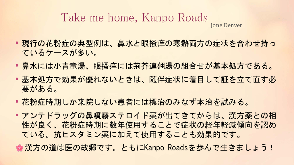 #20. Take me home, Kanpo Roads Jone Denver • 現行の花粉症の典型例は、鼻水と眼掻痒の寒熱両方の症状を合わせ持っ ているケースが多い。 • 鼻水には小青竜湯、眼掻痒には荊芥連翹湯の組合せが基本処方である。 • 基本処方で効果が優れないときは、随伴症状に着目して証を立て直す必 要がある。 • 花粉症時期しか来院しない患者には標治のみなず本治を試みる。 • アンテドラッグの鼻噴霧ステロイド薬が出てきてからは、漢方薬との相 性が良く、花粉症時期に数年使用することで症状の経年軽減傾向を認め ている。抗ヒスタミン薬に加えて使用することも効果的です。 漢方の道は医の故郷です。ともにKanpo Roadsを歩んで生きましょう!