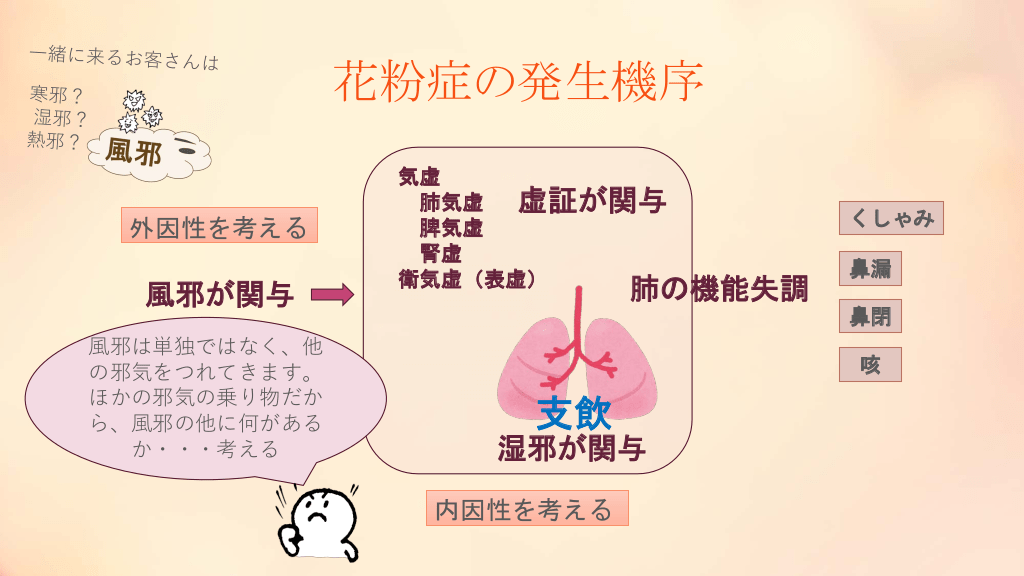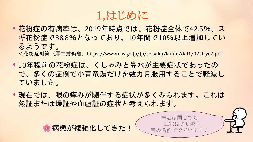 #3. 1,はじめに • 花粉症の有病率は、2019年時点では、花粉症全体で42.5%、ス ギ花粉症で38.8%となっており、10年間で10%以上増加してい るようです。 <花粉症対策(厚⽣労働省)https://www.cas.go.jp/jp/seisaku/kafun/dai1/02siryo2.pdf • 50年程前の花粉症は、くしゃみと鼻水が主要症状であったの で、多くの症例で小青竜湯だけを数カ月服用することで軽減し ていました。 • 現在では、眼の痒みが随伴する症状が多くみられます。これは 熱証または燥証や血虚証の症状と考えられます。 病態が複雑化してきた! 病名は同じでも 症状は少し違う。 昔の名前ででています♪