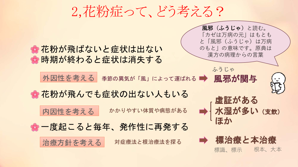 #4. 2,花粉症って、どう考える? 花粉が飛ばないと症状は出ない 時期が終わると症状は消失する 風邪(ふうじゃ)と読む。 「カゼは万病の元」はもとも と「風邪(ふうじゃ)は万病 のもと」の意味です。原典は 漢方の病理からの言葉 ふうじゃ 外因性を考える 季節の異気が「風」によって運ばれる 花粉が飛んでも症状の出ない人もいる 内因性を考える かかりやすい体質や病態がある 一度起こると毎年、発作性に再発する 治療方針を考える 対症療法と根治療法を探る 風邪が関与 虚証がある 水湿が多い(支飲) ほか 標治療と本治療 標識、標示 根本、大本