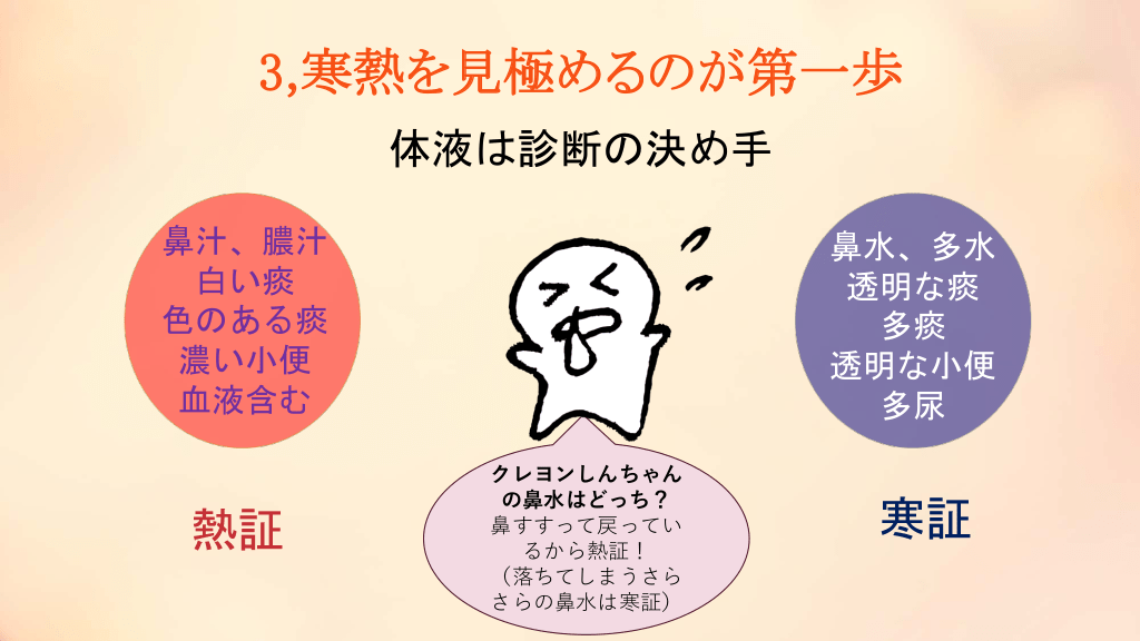 #7. 3,寒熱を見極めるのが第一歩 体液は診断の決め手 鼻汁、膿汁 白い痰 色のある痰 濃い小便 血液含む 熱証 鼻水、多水 透明な痰 多痰 透明な小便 多尿 クレヨンしんちゃん の鼻水はどっち? 鼻すすって戻ってい るから熱証! (落ちてしまうさら さらの鼻水は寒証) 寒証