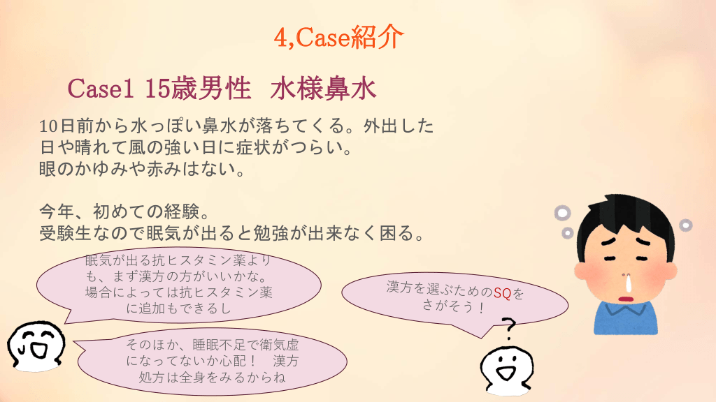 #8. 4,Case紹介 Case1 15歳男性 水様鼻水 10日前から水っぽい鼻水が落ちてくる。外出した 日や晴れて風の強い日に症状がつらい。 眼のかゆみや赤みはない。 今年、初めての経験。 受験生なので眠気が出ると勉強が出来なく困る。 眠気が出る抗ヒスタミン薬より も、まず漢方の方がいいかな。 場合によっては抗ヒスタミン薬 に追加もできるし そのほか、睡眠不足で衛気虚 になってないか心配! 漢方 処方は全身をみるからね