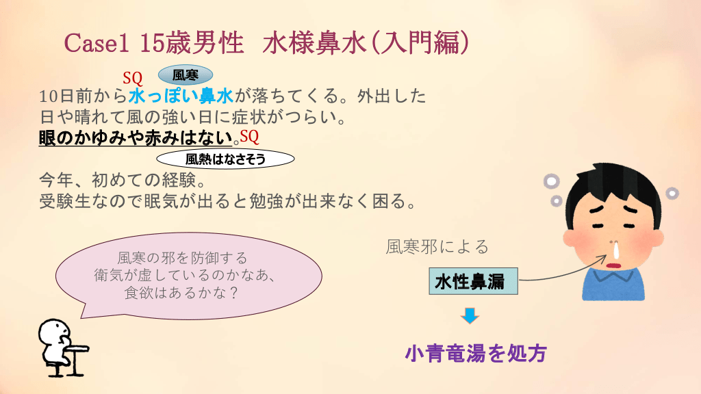 #9. Case1 15歳男性 水様鼻水(入門編) 風寒 SQ 10日前から水っぽい鼻水が落ちてくる。外出した 日や晴れて風の強い日に症状がつらい。 SQ 眼のかゆみや赤みはない。 風熱はなさそう 今年、初めての経験。 受験生なので眠気が出ると勉強が出来なく困る。 風寒の邪を防御する 衛気が虚しているのかなあ、 食欲はあるかな? 風寒邪による 水性鼻漏 小青竜湯を処方