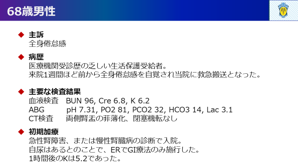 初期加療急性腎障害、または慢性腎臓病の診断で入院。自尿はあるとのことで、ERでGI療法のみ施行した。1時間後のKは5.2であった。