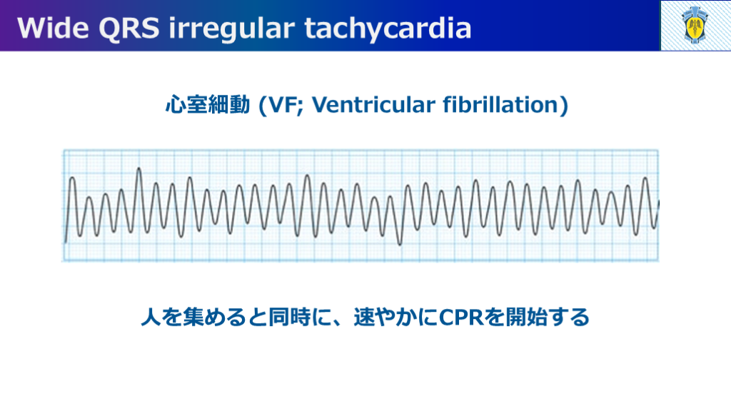 #18. Wide QRS irregular tachycardia 心室細動 (VF; Ventricular fibrillation) 人を集めると同時に、速やかにCPRを開始する
