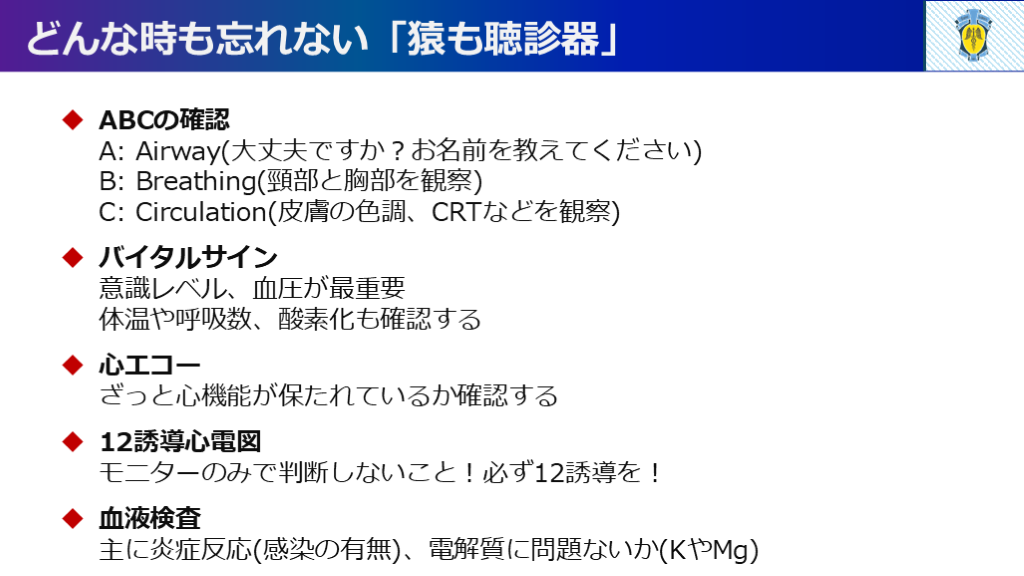 #20. どんな時も忘れない「猿も聴診器」 ABCの確認A: Airway(大丈夫ですか?お名前を教えてください)B: Breathing(頸部と胸部を観察)C: Circulation(皮膚の色調、CRTなどを観察)