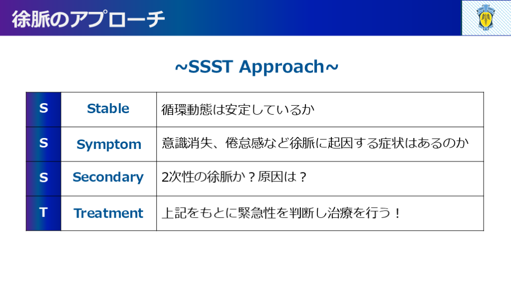 #31. 徐脈のアプローチ ~SSST Approach~ Stable Symptom Secondary Treatment 循環動態は安定しているか 意識消失、倦怠感など徐脈に起因する症状はあるのか 2次性の徐脈か?原因は? 上記をもとに緊急性を判断し治療を行う!