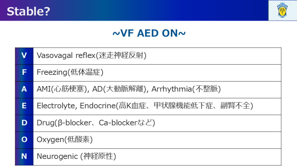 #32. Stable? ~VF AED ON~ Vasovagal reflex(迷走神経反射) Freezing(低体温症) AMI(心筋梗塞), AD(大動脈解離), Arrhythmia(不整脈) Electrolyte, Endocrine(高K血症、甲状腺機能低下症、副腎不全) Drug(β-blocker、Ca-blockerなど) Oxygen(低酸素) Neurogenic (神経原性)