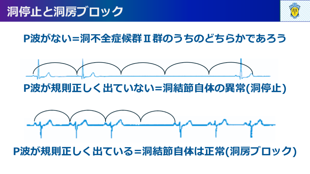 #39. 洞停止と洞房ブロック P波が規則正しく出ていない=洞結節自体の異常(洞停止) P波が規則正しく出ている=洞結節自体は正常(洞房ブロック) P波がない=洞不全症候群Ⅱ群のうちのどちらかであろう