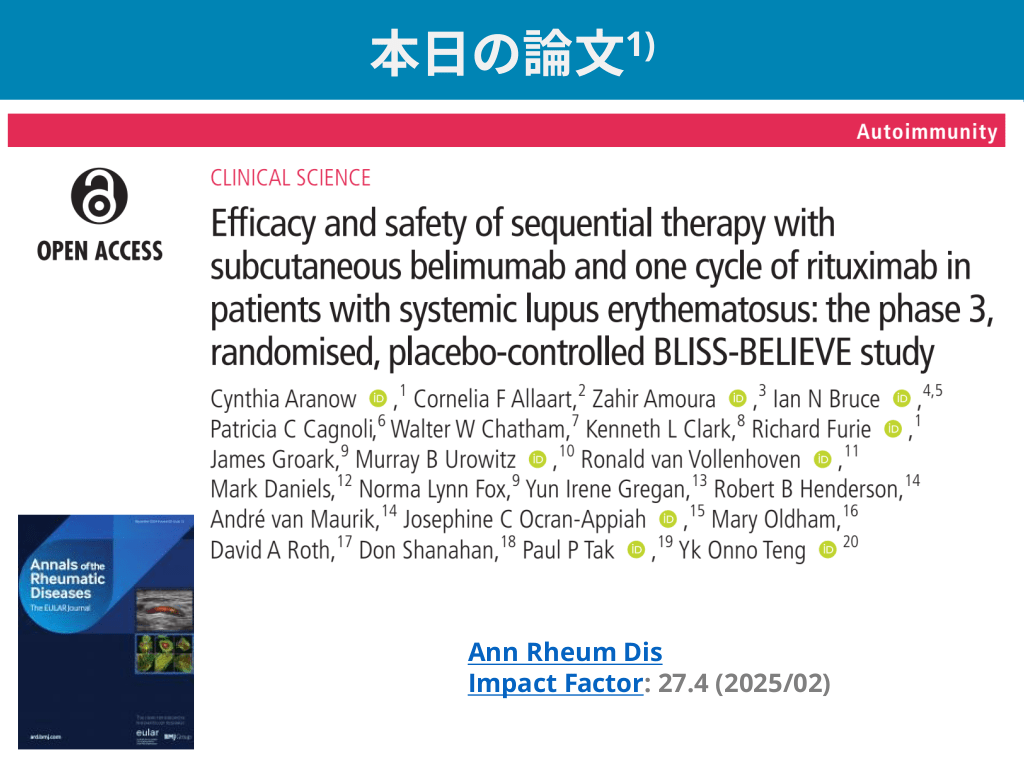 Aranow C, Allaart CF, Amoura Z, Bruce IN, Cagnoli PC, Chatham WW,et al. Efficacy and safety of sequential therapy with subcutaneous belimumab and one cycle of rituximab in patients with systemic lupus erythematosus: the phase 3, randomised, placebo-controlled BLISS-BELIEVE study. Ann Rheum Dis. 2024 Oct 21;83(11):1502-1512. PMID: 39159997.