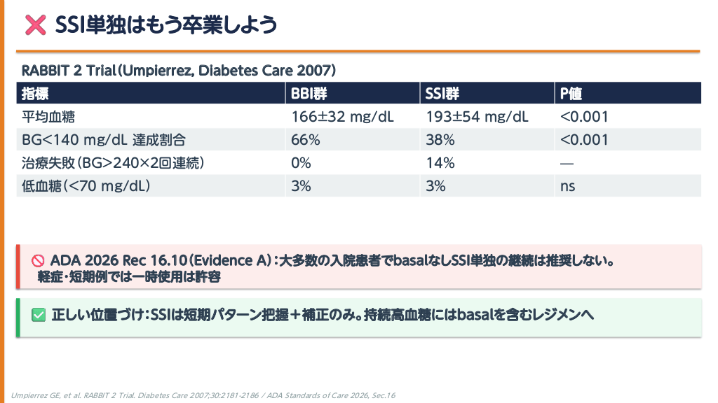 #10. SSI単独はもう卒業しよう RABBIT 2 Trial(Umpierrez, Diabetes Care 2007) 指標 BBI群 SSI群 P値 平均血糖 166±32 mg/dL 193±54 mg/dL <0.001 BG<140 mg/dL 達成割合 66% 38% <0.001 治療失敗(BG>240×2回連続) 0% 14% — 低血糖(<70 mg/dL) 3% 3% ns ADA 2026 Rec 16.10(Evidence A):大多数の入院患者でbasalなしSSI単独の継続は推奨しない。 軽症・短期例では一時使用は許容 正しい位置づけ:SSIは短期パターン把握+補正のみ。持続高血糖にはbasalを含むレジメンへ Umpierrez GE, et al. RABBIT 2 Trial. Diabetes Care 2007;30:2181-2186 / ADA Standards of Care 2026, Sec.16