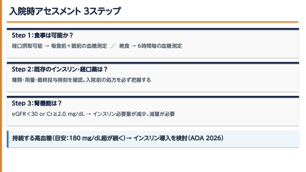 #12. 入院時アセスメント 3ステップ Step 1:食事は可能か? 経口摂取可能 → 毎食前+眠前の血糖測定 / 絶食 → 6時間毎の血糖測定 Step 2:既存のインスリン・経口薬は? 種類・用量・最終投与時刻を確認。入院前の処方を必ず把握する Step 3:腎機能は? eGFR<30 or Cr≧2.0 mg/dL → インスリン必要量が減少、減量が必要 持続する高血糖(目安:180 mg/dL超が続く)→ インスリン導入を検討(ADA 2026)