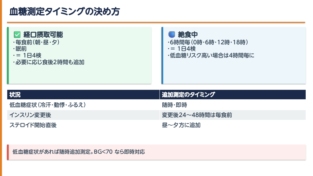 #13. 血糖測定タイミングの決め方 経口摂取可能 ・毎食前(朝・昼・夕) ・眠前 ・= 1日4検 ・必要に応じ食後2時間も追加 絶食中 ・6時間毎(0時・6時・12時・18時) ・= 1日4検 ・低血糖リスク高い場合は4時間毎に 状況 追加測定のタイミング 低血糖症状(冷汗・動悸・ふるえ) 随時・即時 インスリン変更後 変更後24~48時間は毎食前 ステロイド開始直後 昼~夕方に追加 低血糖症状があれば随時追加測定。BG<70 なら即時対応