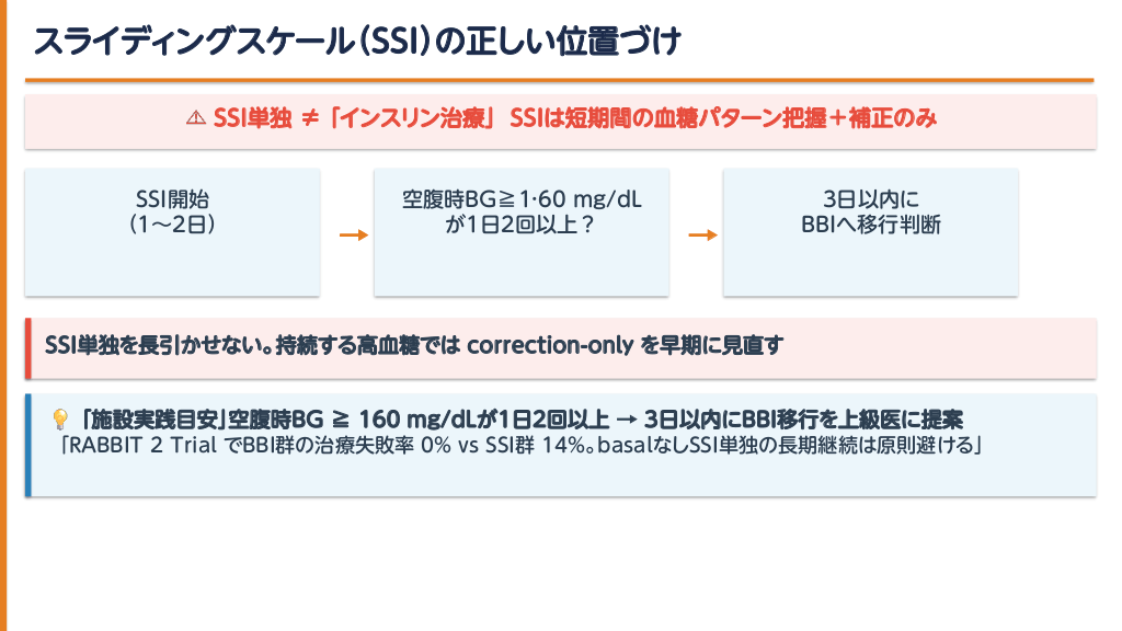 #14. スライディングスケール(SSI)の正しい位置づけ SSI単独 ≠ 「インスリン治療」 SSIは短期間の血糖パターン把握+補正のみ SSI開始 (1~2日) → 空腹時BG≧1·60 mg/dL が1日2回以上? → 3日以内に BBIへ移行判断 SSI単独を長引かせない。持続する高血糖では correction-only を早期に見直す 「施設実践目安」空腹時BG ≧ 160 mg/dLが1日2回以上 → 3日以内にBBI移行を上級医に提案 「RABBIT 2 Trial でBBI群の治療失敗率 0% vs SSI群 14%。basalなしSSI単独の長期継続は原則避ける」