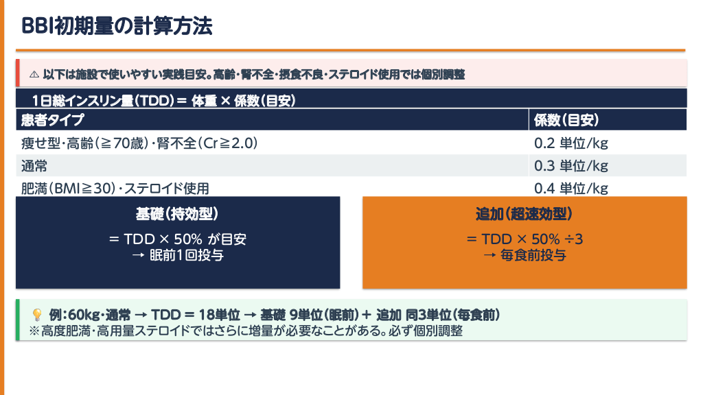 #15. BBI初期量の計算方法 以下は施設で使いやすい実践目安。高齢・腎不全・摂食不良・ステロイド使用では個別調整 1日総インスリン量(TDD)= 体重 × 係数(目安) 患者タイプ 係数(目安) 痩せ型・高齢(≧70歳)・腎不全(Cr≧2.0) 0.2 単位/kg 通常 0.3 単位/kg 肥満(BMI≧30)・ステロイド使用 0.4 単位/kg 基礎(持効型) 追加(超速効型) = TDD × 50% が目安 → 眠前1回投与 = TDD × 50% ÷3 → 毎食前投与 例:60kg・通常 → TDD = 18単位 → 基礎 9単位(眠前)+ 追加 同3単位(毎食前) ※高度肥満・高用量ステロイドではさらに増量が必要なことがある。必ず個別調整