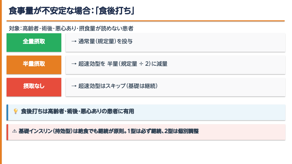 #16. 食事量が不安定な場合:「食後打ち」 対象:高齢者・術後・悪心あり・摂食量が読めない患者 全量摂取 → 通常量(規定量)を投与 半量摂取 → 超速効型を 半量(規定量 ÷ 2)に減量 摂取なし → 超速効型はスキップ(基礎は継続) 食後打ちは高齢者・術後・悪心ありの患者に有用 基礎インスリン(持効型)は絶食でも継続が原則。1型は必ず継続、2型は個別調整
