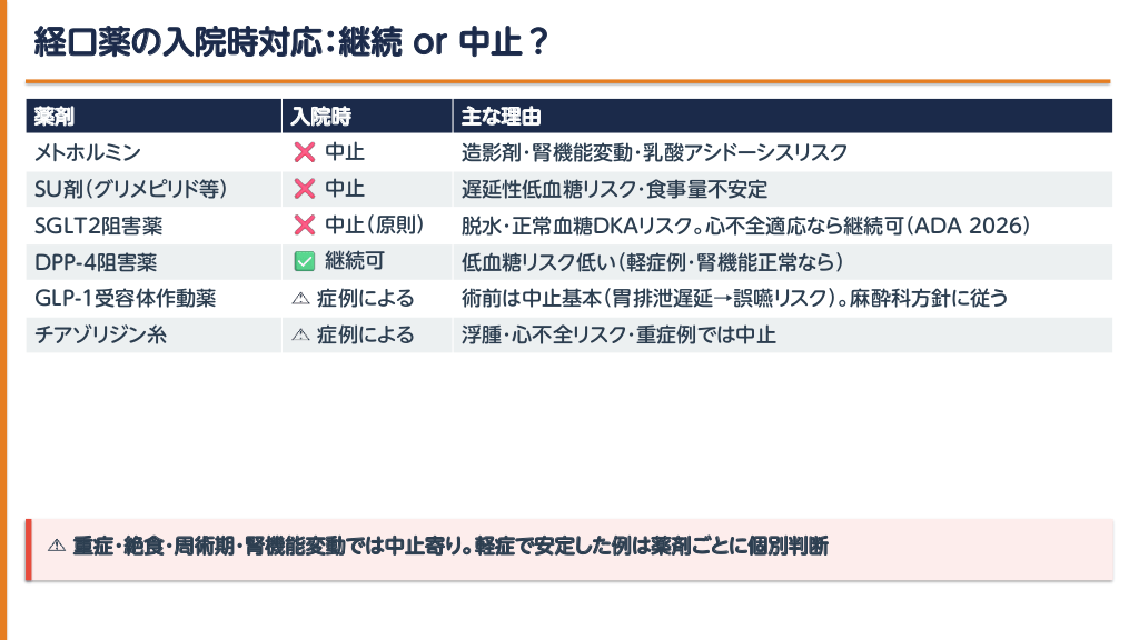 #17. 経口薬の入院時対応:継続 or 中止? 薬剤 入院時 主な理由 メトホルミン 中止 造影剤・腎機能変動・乳酸アシドーシスリスク SU剤(グリメピリド等) 中止 遅延性低血糖リスク・食事量不安定 SGLT2阻害薬 中止(原則) 脱水・正常血糖DKAリスク。心不全適応なら継続可(ADA 2026) DPP-4阻害薬 継続可 低血糖リスク低い(軽症例・腎機能正常なら) GLP-1受容体作動薬 症例による 術前は中止基本(胃排泄遅延→誤嚥リスク)。麻酔科方針に従う チアゾリジン糸 症例による 浮腫・心不全リスク・重症例では中止 重症・絶食・周術期・腎機能変動では中止寄り。軽症で安定した例は薬剤ごとに個別判断