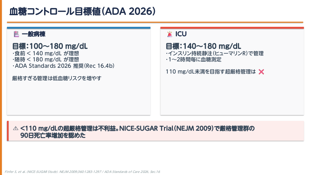 #18. 血糖コントロール目標値(ADA 2026) 一般病棟 ICU 目標:100~180 mg/dL 目標:140~180 mg/dL ・食前 < 140 mg/dL が理想 ・随時 < 180 mg/dL が理想 ・ADA Standards 2026 推奨(Rec 16.4b) ・インスリン持続静注(ヒューマリンR)で管理 ・1~2時間毎に血糖測定 110 mg/dL未満を目指す超厳格管理は 厳格すぎる管理は低血糖リスクを増やす <110 mg/dLの超厳格管理は不利益。NICE-SUGAR Trial(NEJM 2009)で厳格管理群の 90日死亡率増加を認めた Finfer S, et al. (NICE-SUGAR Study). NEJM 2009;360:1283-1297 / ADA Standards of Care 2026, Sec.16