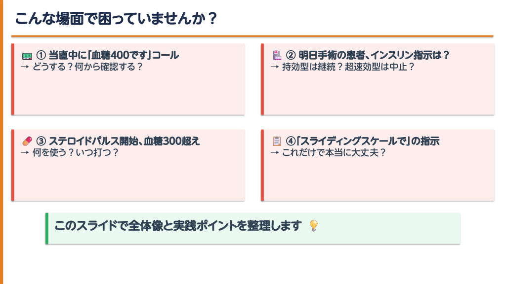 #2. こんな場面で困っていませんか? ① 当直中に「血糖400です」コール → どうする?何から確認する? ③ ステロイドパルス開始、血糖300超え → 何を使う?いつ打つ? ② 明日手術の患者、インスリン指示は? → 持効型は継続?超速効型は中止? ④「スライディングスケールで」の指示 → これだけで本当に大丈夫? このスライドで全体像と実践ポイントを整理します