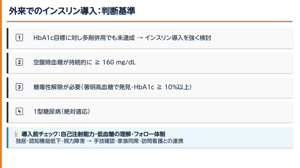 #20. 外来でのインスリン導入:判断基準 1️⃣ HbA1c目標に対し多剤併用でも未達成 → インスリン導入を強く検討 2️⃣ 空腹時血糖が持続的に ≧ 160 mg/dL 3️⃣ 糖毒性解除が必要(著明高血糖で発見・HbA1c ≧ 10%以上) 4️⃣ 1型糖尿病(絶対適応) 導入前チェック:自己注射能力・低血糖の理解・フォロー体制 独居・認知機能低下・視力障害 → 手技確認・家族同席・訪問看護との連携