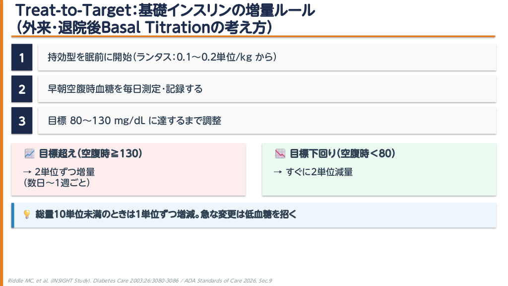 #21. Treat-to-Target:基礎インスリンの増量ルール (外来・退院後Basal Titrationの考え方) 1 持効型を眠前に開始(ランタス:0.1~0.2単位/kg から) 2 早朝空腹時血糖を毎日測定・記録する 3 目標 80~130 mg/dL に達するまで調整 目標超え(空腹時≧130) → 2単位ずつ増量 (数日~1週ごと) 目標下回り(空腹時<80) → すぐに2単位減量 総量10単位未満のときは1単位ずつ増減。急な変更は低血糖を招く Riddle MC, et al. (INSIGHT Study). Diabetes Care 2003;26:3080-3086 / ADA Standards of Care 2026, Sec.9