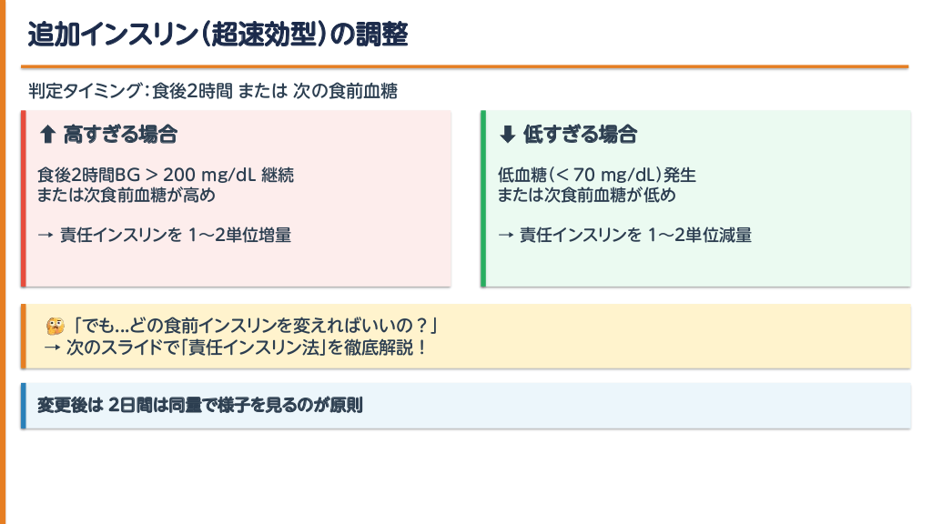 #22. 追加インスリン(超速効型)の調整 判定タイミング:食後2時間 または 次の食前血糖 高すぎる場合 低すぎる場合 食後2時間BG > 200 mg/dL 継続 または次食前血糖が高め 低血糖(< 70 mg/dL)発生 または次食前血糖が低め → 責任インスリンを 1~2単位増量 → 責任インスリンを 1~2単位減量 「でも...どの食前インスリンを変えればいいの?」 → 次のスライドで「責任インスリン法」を徹底解説! 変更後は 2日間は同量で様子を見るのが原則