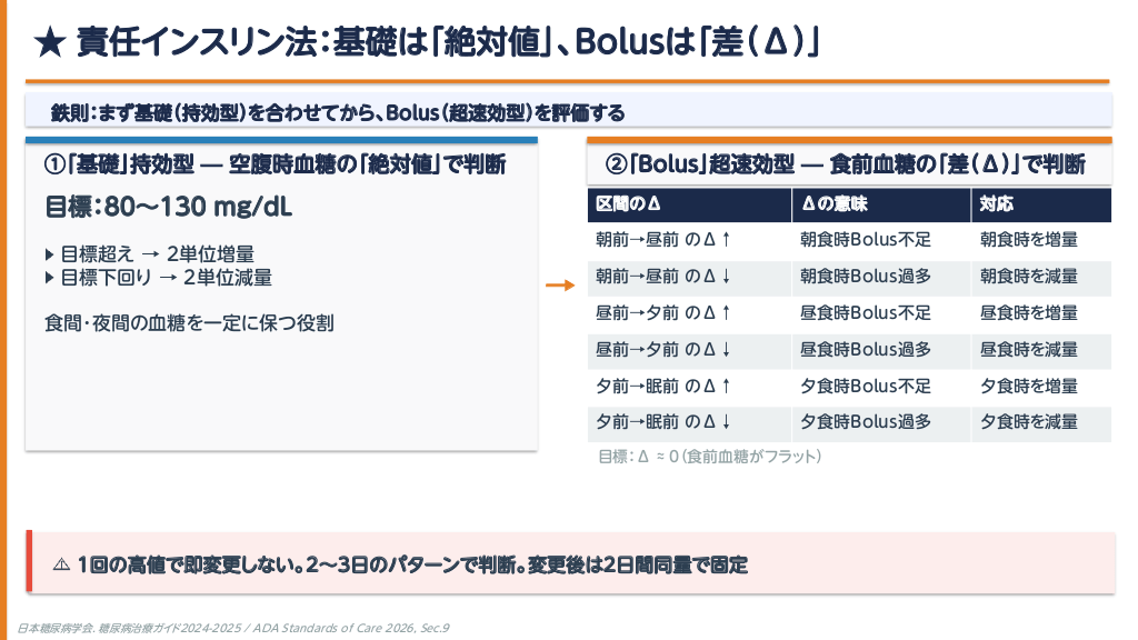 #23. ★ 責任インスリン法:基礎は「絶対値」、Bolusは「差(Δ)」 鉄則:まず基礎(持効型)を合わせてから、Bolus(超速効型)を評価する ①「基礎」持効型 — 空腹時血糖の「絶対値」で判断 ②「Bolus」超速効型 — 食前血糖の「差(Δ)」で判断 目標:80~130 mg/dL 目標超え → 2単位増量 目標下回り → 2単位減量 食間・夜間の血糖を一定に保つ役割 → 区間のΔ Δの意味 対応 朝前→昼前 のΔ↑ 朝食時Bolus不足 朝食時を増量 朝前→昼前 のΔ↓ 朝食時Bolus過多 朝食時を減量 昼前→夕前 のΔ↑ 昼食時Bolus不足 昼食時を増量 昼前→夕前 のΔ↓ 昼食時Bolus過多 昼食時を減量 夕前→眠前 のΔ↑ 夕食時Bolus不足 夕食時を増量 夕前→眠前 のΔ↓ 夕食時Bolus過多 夕食時を減量 目標:Δ ≈ 0(食前血糖がフラット) 1回の高値で即変更しない。2~3日のパターンで判断。変更後は2日間同量で固定 日本糖尿病学会. 糖尿病治療ガイド2024-2025 / ADA Standards of Care 2026, Sec.9
