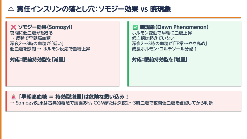 #24. 責任インスリンの落とし穴:ソモジー効果 vs 暁現象 ソモジー効果(Somogyi) 暁現象(Dawn Phenomenon) 夜間に低血糖が起きる → 反動で早朝高血糖 深夜2~3時の血糖が「低い」 低血糖を感知 → ホルモン反応で血糖上昇 ホルモン変動で早朝に血糖上昇 低血糖は起きていない 深夜2~3時の血糖が「正常~やや高め」 成長ホルモン・コルチゾール分泌↑ 対応:眠前持効型を「減量」 対応:眠前持効型を「増量」 「早朝高血糖 = 持効型増量」は危険な思い込み! → Somogyi効果は古典的概念で議論あり。CGMまたは深夜2~3時血糖で夜間低血糖を確認してから判断