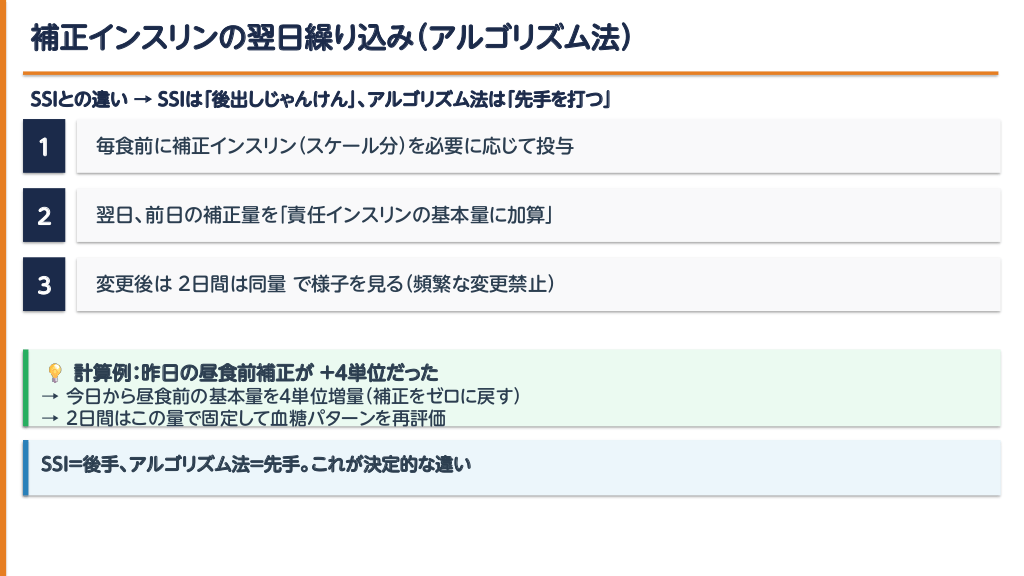 #25. 補正インスリンの翌日繰り込み(アルゴリズム法) SSIとの違い → SSIは「後出しじゃんけん」、アルゴリズム法は「先手を打つ」 1 毎食前に補正インスリン(スケール分)を必要に応じて投与 2 翌日、前日の補正量を「責任インスリンの基本量に加算」 3 変更後は 2日間は同量 で様子を見る(頻繁な変更禁止) 計算例:昨日の昼食前補正が +4単位だった → 今日から昼食前の基本量を4単位増量(補正をゼロに戻す) → 2日間はこの量で固定して血糖パターンを再評価 SSI=後手、アルゴリズム法=先手。これが決定的な違い